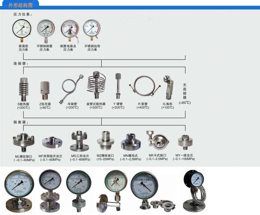 直接式(被測介質溫度<80℃) 阻尼器 散熱器(被測介質溫度<200℃) 硬管連接(被測介質溫度<200℃) 1/2/4 軟管連接(數字代表軟管長度,單位m) 角型連接(被測介質溫度<150℃) |