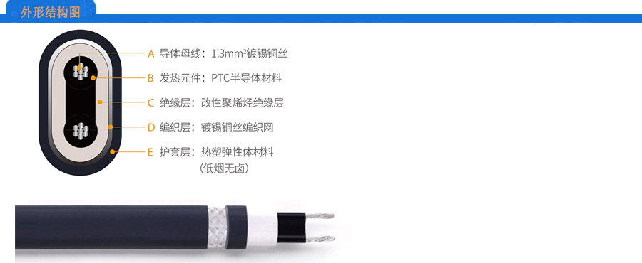 自限溫電伴熱帶也稱為自限溫伴熱電纜。是用電熱補充被伴熱介質在工藝流程中所散失的熱量,以維持其在工藝過程中所要求的溫度。自限式電熱帶的帶芯是一種高分子復合物,它由多種材料和導電介質復合而成,經過特定的化學變化和物理處理之后擠出成型,在兩條平行導線之間組成的一條保持連續平行的加熱原件。