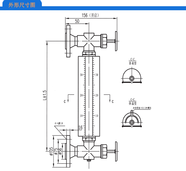 儀表上下閥都裝有PN1.6MPa,DN20的法蘭。通過焊接在容器上的法蘭,與容器組成連通器,透過玻璃管就可直接顯示容器內(nèi)介質(zhì)液位的高度。