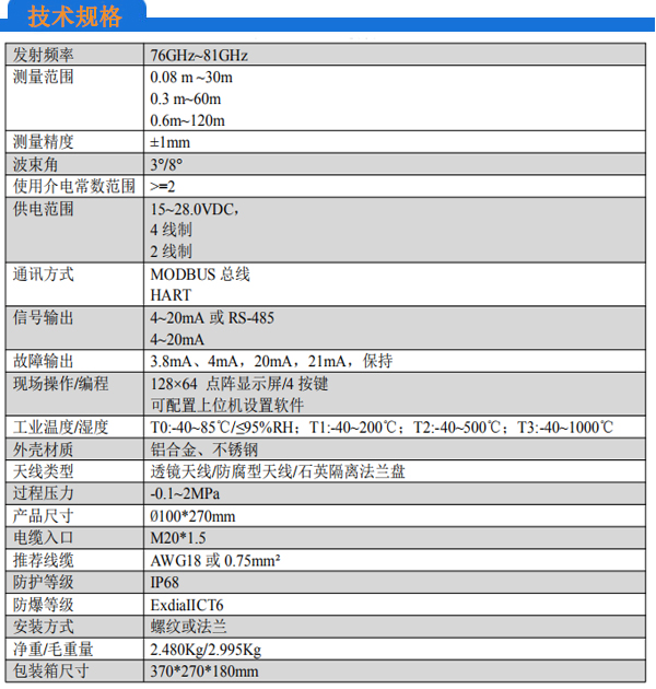 SC-URD880系列調(diào)頻連續(xù)波雷達(dá)物位計采用了76-81GHz的調(diào)頻連續(xù)波,產(chǎn)品zui大量程可以達(dá)到120m盲區(qū)可以做到8cm。zui窄3°天線波束角,安裝環(huán)境中的干擾對儀表的影響更小,安裝更為便捷。波長更短,在固體表面具有更好的反射特性,因而不需要特別的使用萬向法蘭來進(jìn)行瞄準(zhǔn)。