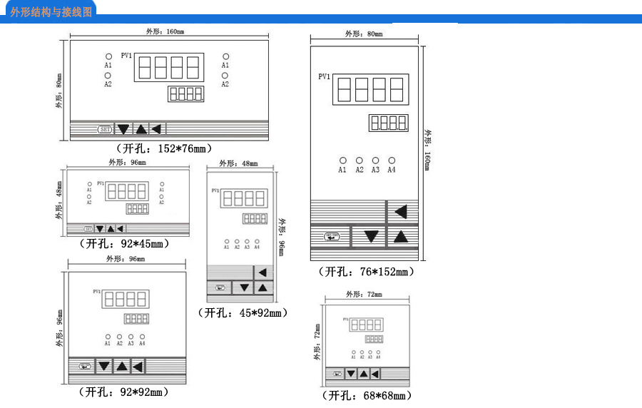 橫式160×80mm (開孔152×76mm) 豎式80×160mm (開孔76×152mm) 橫式96×48mm (開孔92×45mm) 方式96×96mm (開孔92×92mm) 方式72×72mm (開孔68×68mm) 方式48×48mm (開孔45×45mm) |